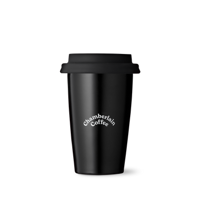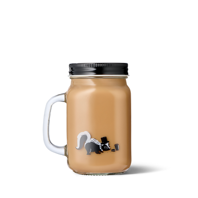 Our limited edition mason jar with black logo. The back features a skunk character.